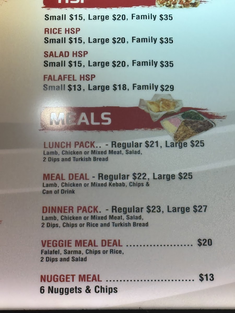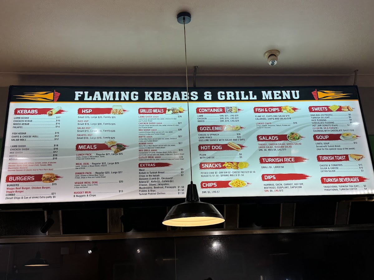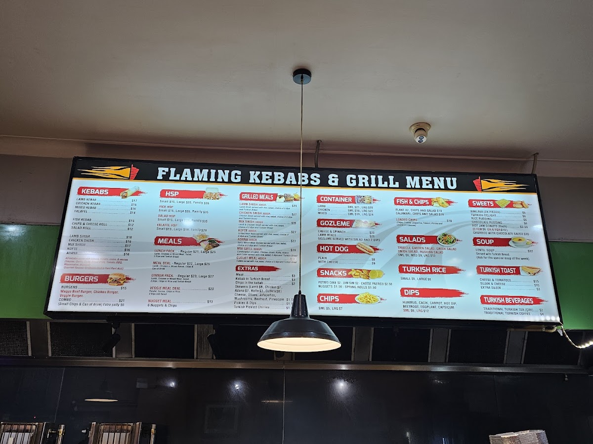 Flaming Kebabs & Grill in Yarraville offers a diverse menu that is sure to satisfy a wide range of tastes. Their HSP options are particularly popular, including the classic HSP and variations like Rice HSP and Falafel HSP, each packed with flavors. For kebab lovers, the selection includes the Mixed Kebab, Lamb Shish Kebab, and Chicken Kebab, as well as the flavorful Kofte Kebab and Chicken Shish Kebab. Their Grilled Meals include standout choices such as Mix Shish, Lamb Shish, and Chicken Shish Kofte. For those seeking lighter options, they offer a range of Turkish Rice sizes, from Small Rice to Large Rice. If you're in the mood for something quick, the Hot Dog provides a casual, comforting bite. In terms of sides, crispy Chips and a selection of Breads, like Turkish Bread and Full Turkish Bread (toasted and buttered), are available to complement any dish. The Dips, including Humus, Cacik, and Eggplant, are perfect for adding a little extra flavor. Their Gozleme options, such as Lamb Mince Gozleme and Cheese and Spinach Gozleme, provide a delightful and savory experience. For a refreshing drink, choose from Ayran, V Energy Drink, or a simple Canned Drink. When it comes to dessert, Baklava, Turkish Delight, and Rice Pudding with cinnamon topping are available to end the meal on a sweet note. The restaurant also offers Deals like the Lunch Pack and Veggie Meal Deal, ensuring there's something for everyone. Whether you're after a hearty meal or a light snack, Flaming Kebabs & Grill delivers delicious options for every craving.