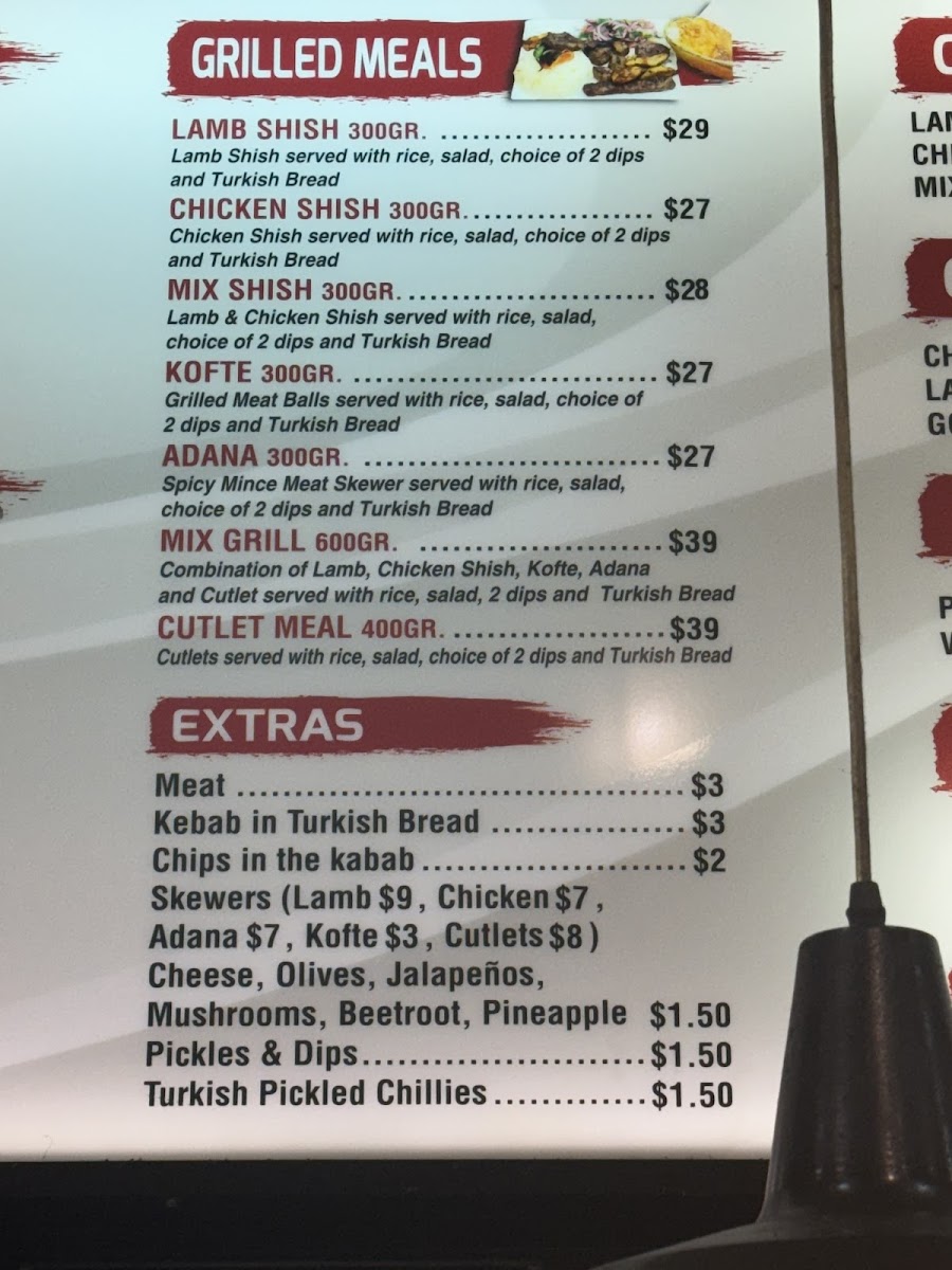 Lamb shish served with rice, salad, choice of two dips and Turkish bread.